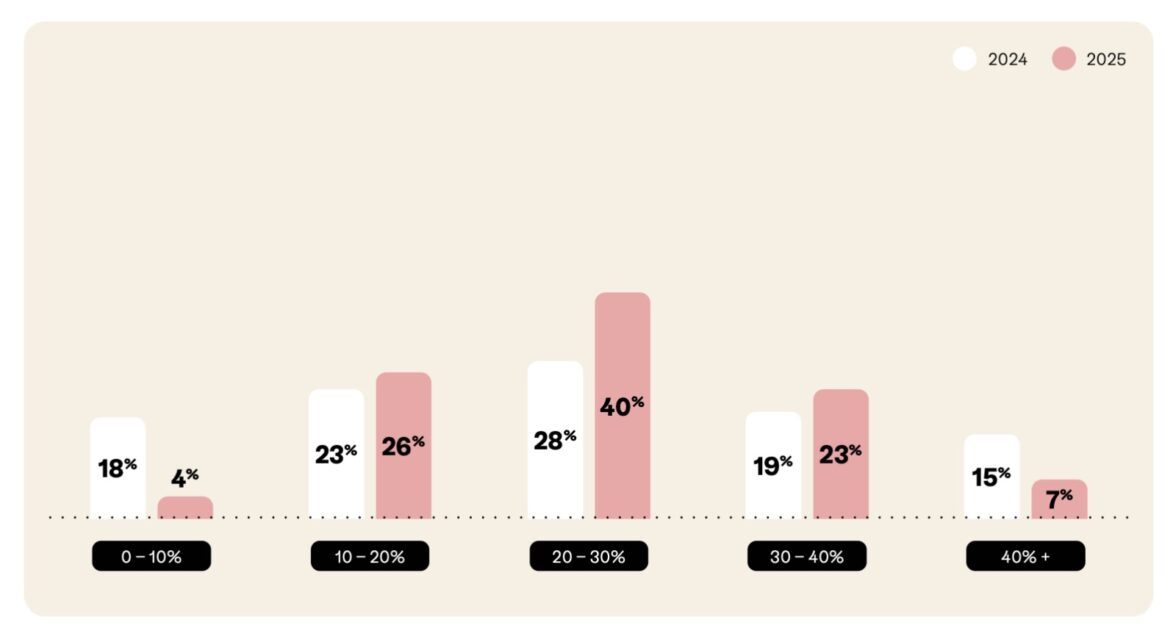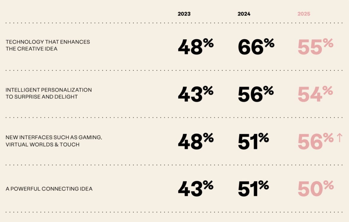 Инновационные технологии превращаются из того, что хочется иметь, в то, что необходимо иметь. 70% директоров по маркетингу планируют инвестировать более 20% своего бюджета в инновации в 2025 году (в 2024 году — 59%). При этом девять из десяти (90%) согласны с тем, что инновации нужны им для решения самых насущных бизнес-задач, а не как побочный проект.
