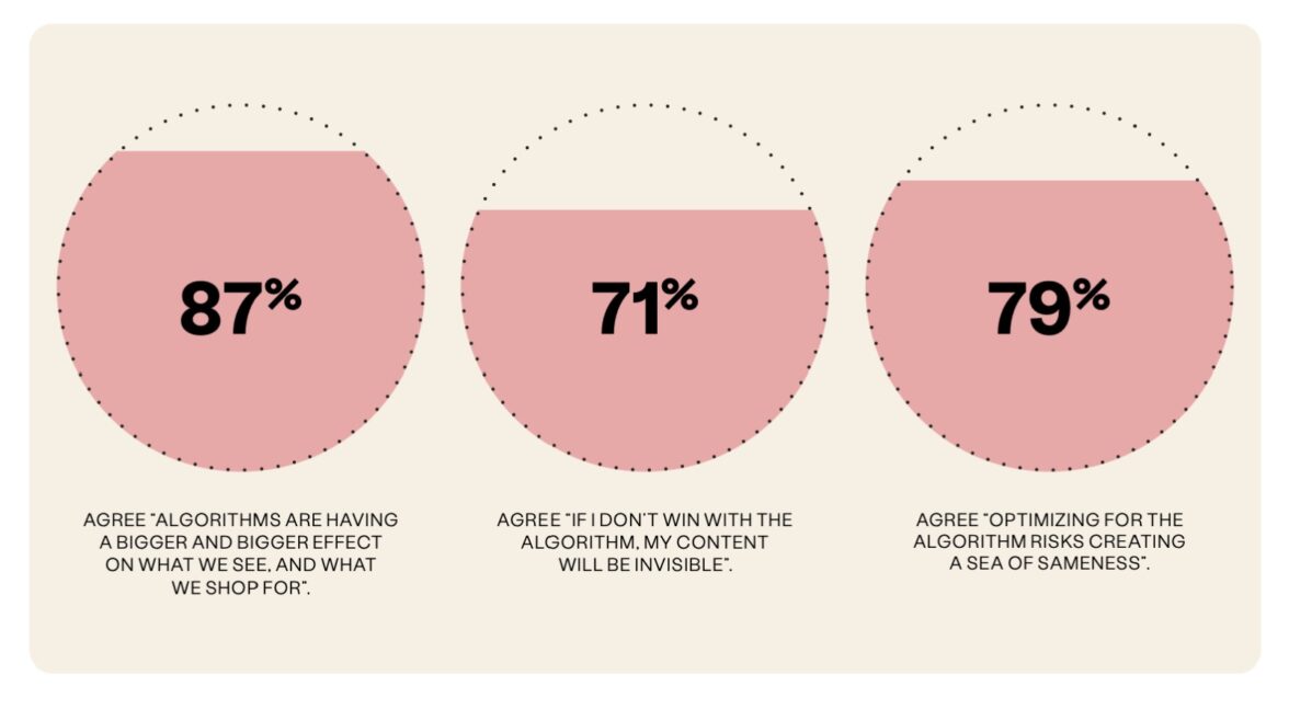 Процент опрошенных, согласившихся со следующими утверждениями (слева направо): «Алгоритмы оказывают все большее и большее влияние на то, что мы видим, и то, что мы покупаем»; «Если я не одержу победу над алгоритмом, мой контент не увидят»; «Оптимизация ради алгоритма создает риск возникновения моря одинакового контента».