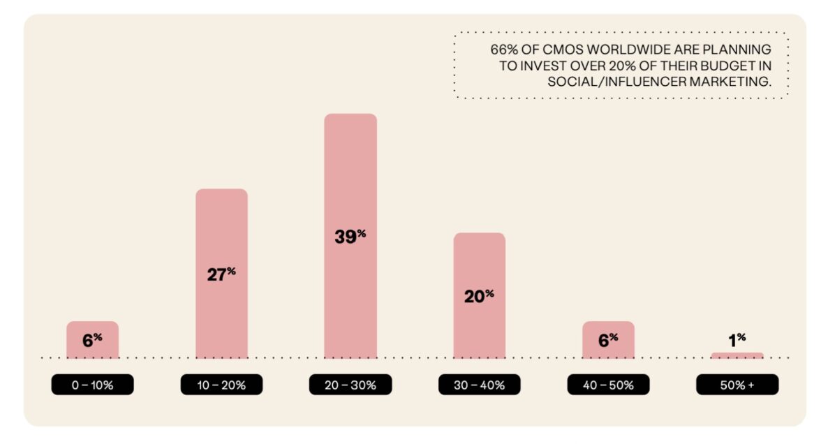 Надпись в правом верхнем углу: «66% директоров по маркетингу в мире планируют инвестировать более 20% своего бюджета в маркетинг в соцсетях и в сотрудничество с инфлюенсерами». Розовые столбики — процент опрошенных, давших соответствующий ответ. На черном фоне — доля бюджета, которую планируется потратить на маркетинг в соцсетях и в сотрудничество с инфлюенсерами.
