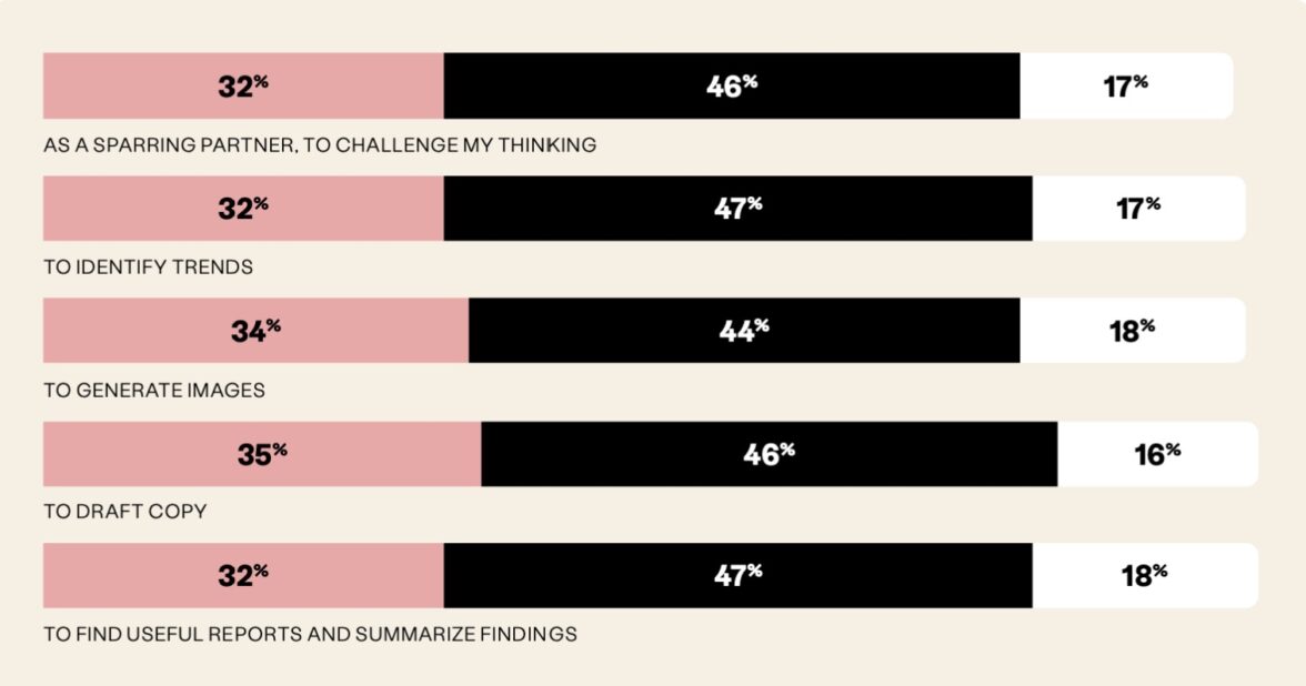 Как часто опрошенные используют ИИ и с какими целями. Розовый — ежедневно, черный — еженедельно, белый — ежемесячно. Сверху вниз: как спарринг-партнера, сравнивая с собственными идеями; для определения трендов; для создания изображений; для подготовки черновиков; для поиска полезных докладов и резюмирования содержащейся в них информации.