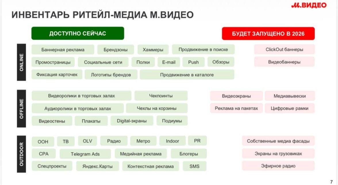 Омниканальная инфраструктура М.Видео формирует широкий рекламный инвентарь для партнеров. Брендам доступны размещения на сайте и в мобильном приложении, продвижение в поиске и каталоге, баннерные форматы, коммуникации через CRM-каналы — email, push-уведомления, SMS и мессенджеры, а также медиаформаты в магазинах — цифровые экраны, видеоролики, аудиореклама, бренд-зоны и специальные маркетинговые активности.