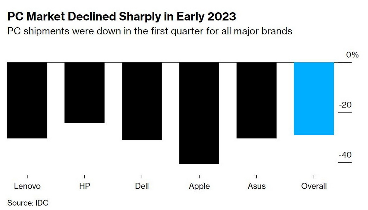 Поставки компьютеров Apple в первом квартале 2023 года упали на 40,5%, сообщается в отчете исследовательской компании IDC. В похожей ситуации оказались все крупнейшие производители ПК — рост продаж, выросший из-за удаленной работы в разгар пандемии, сменился падением. В совокупности поставки компьютеров в первом квартале текущего года упали на 29%, до 56,9 млн штук, что ниже уровня начала 2019 года. Сокращение продаж Apple оказалось наиболее драматичным, отгрузки продукции Asustek упали на 30,3%, Lenovo и Dell — на 30%, Hewlett-Packard — на 24,2%.