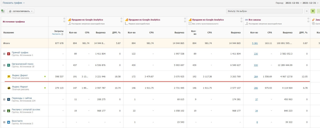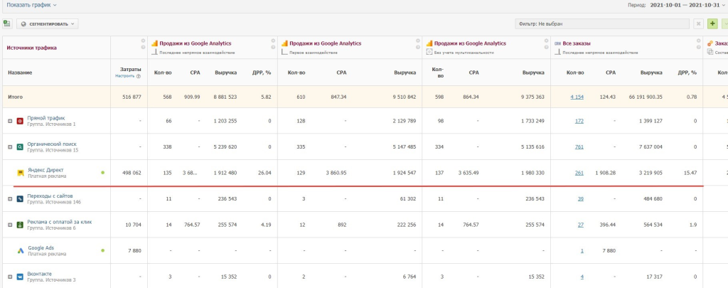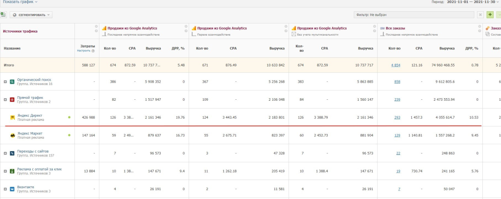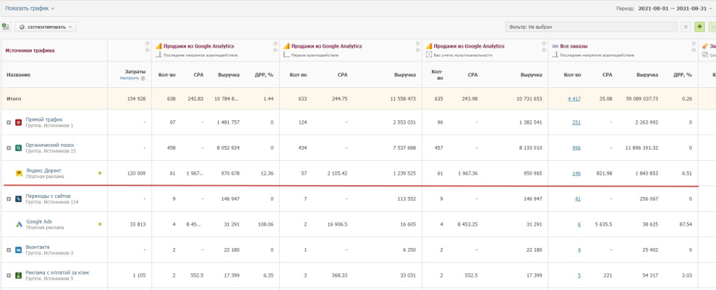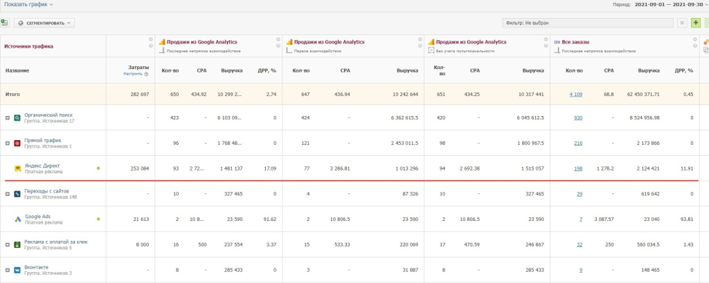 С заказчиком был установлен предел значения ДРР 20% по верхней границе, соблюдая который реклама приносит прибыль. Для базовых тестов и фиксации результатов был выделен период в два месяца, далее был момент принятия решения о продлении рекламных кампаний. Ниже скриншоты из сквозной аналитики с результатами за август-сентябрь 2021 года.