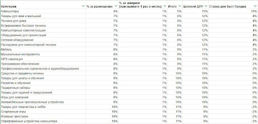 Для выбора приемлемой ставки мы готовим сводную таблицу. В ней для каждой категории, в которой у клиента есть товар, проставляем % комиссии Маркета. Со своей стороны клиент прописывает сумму, которую он готов тратить. В дальнейшем разницу между этими графами в таблице мы используем как ставку в Бусте.