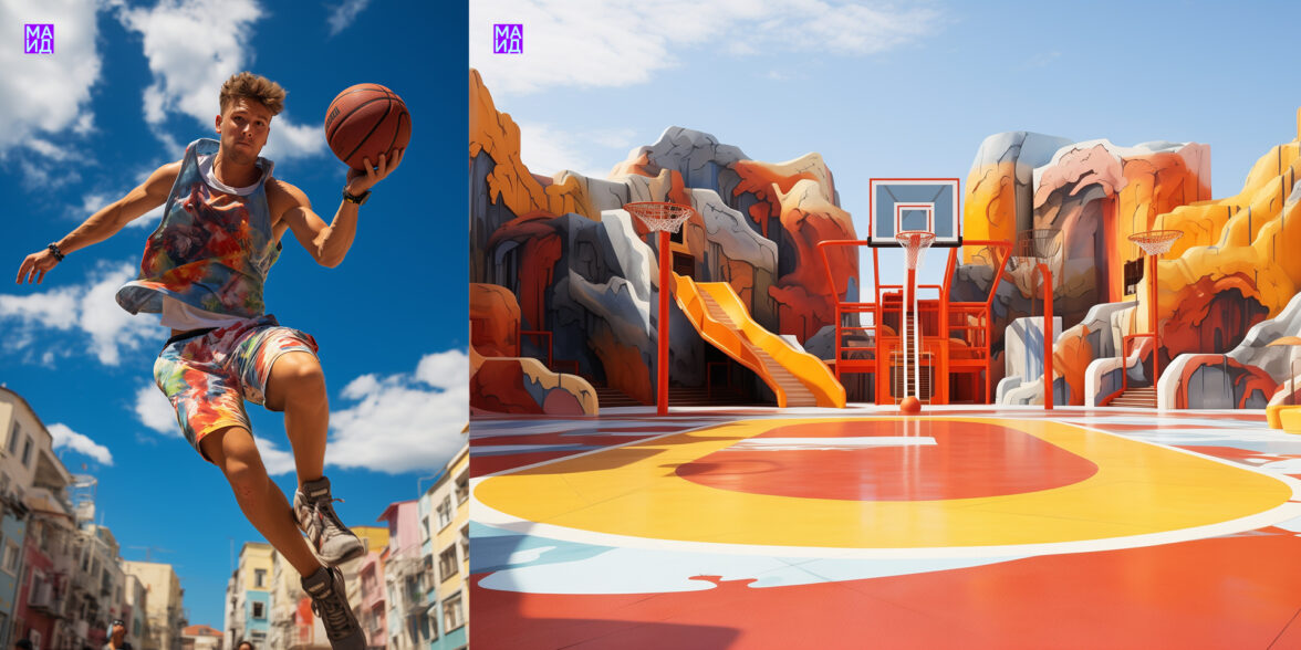 Визуальная коммуникация бренда баскетбольной команды от Академии МАИД.РФ. Курс «Нейросети для дизайна» для магистрантов РГУ имени Косыгина. Нейросеть: Midjourney