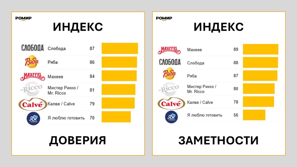 Лидерами рынка по уровню заметности являются бренды «Махеев», «Слобода» и «Ряба», о которых знает подавляющее большинство россиян. Их индексы заметности составляют 89, 88 и 87 пунктов соответственно. Высокая осведомленность об этих брендах — результат долгосрочной работы на рынке, активной рекламной политики и широкой дистрибуции.