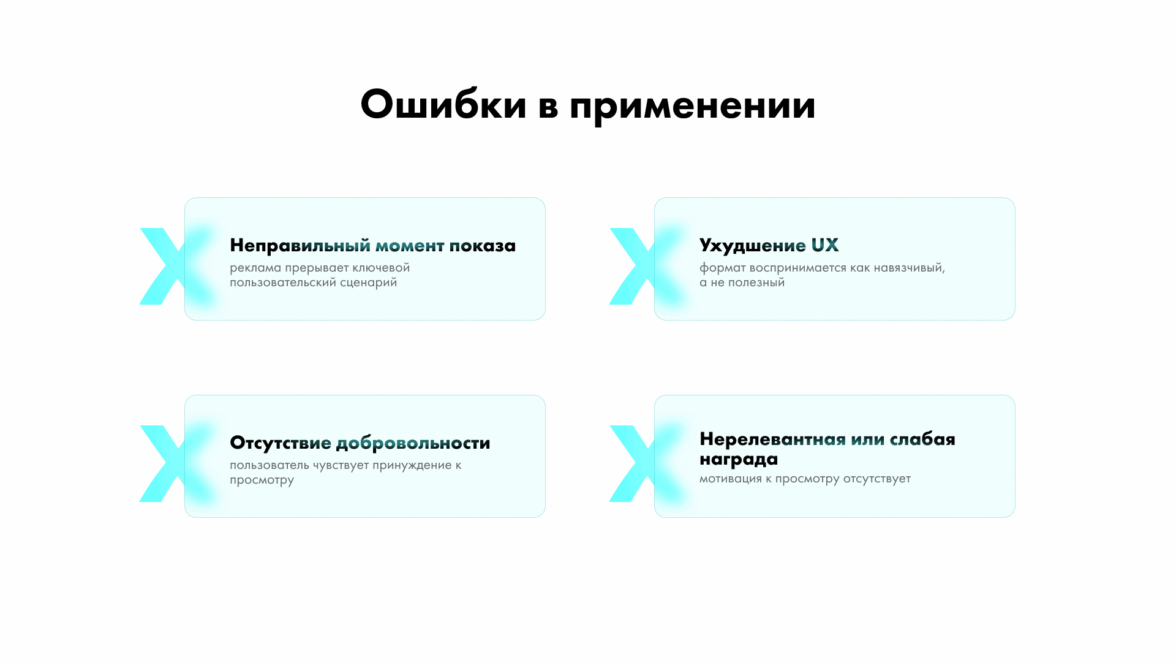 3. Отсутствие добровольности. Если пользователь вынужден смотреть рекламу, конверсия и лояльность снижаются. У аудитории всегда должна оставаться возможность пользоваться приложением без просмотра.