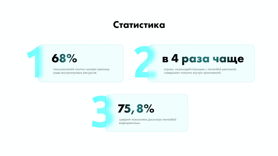 По данным TechCrunch, 68% игроков положительно относятся к этому формату. Более того, пользователи, взаимодействующие с вознаграждаемой видеорекламой, в 6 раз чаще совершают покупки внутри приложения.