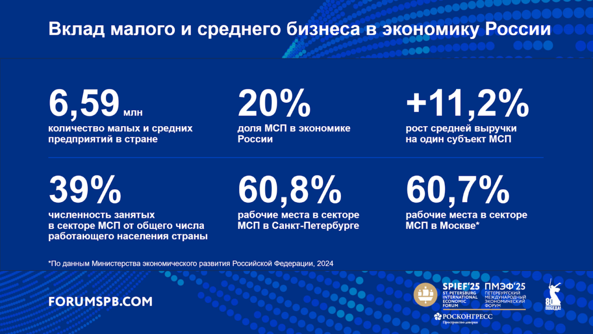 Малый и средний бизнес вносит существенный вклад в экономику России: его доля составила 20% в 2024 году по данным Министерства экономического развития Российской Федерации. При этом в МСП задействовано достаточно большое количество людей. Их численность в среднем составляет 39% от общего числа работающего населения в стране, а по Москве и Санкт-Петербургу этот процент значительно выше.