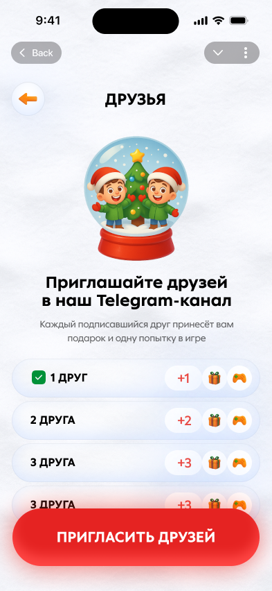 1 приглашённый друг → +1 попытка и +1 подарок;