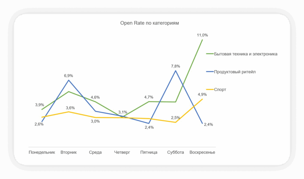 • А вот в категории «Бытовая техника и электроника» — совсем другие цифры: Open Rate в воскресенье — 11,01%, Click Rate — до 0.91% (!).