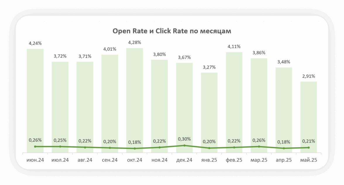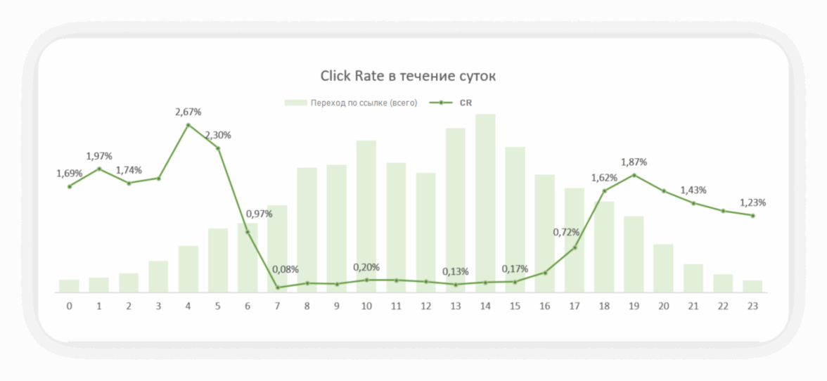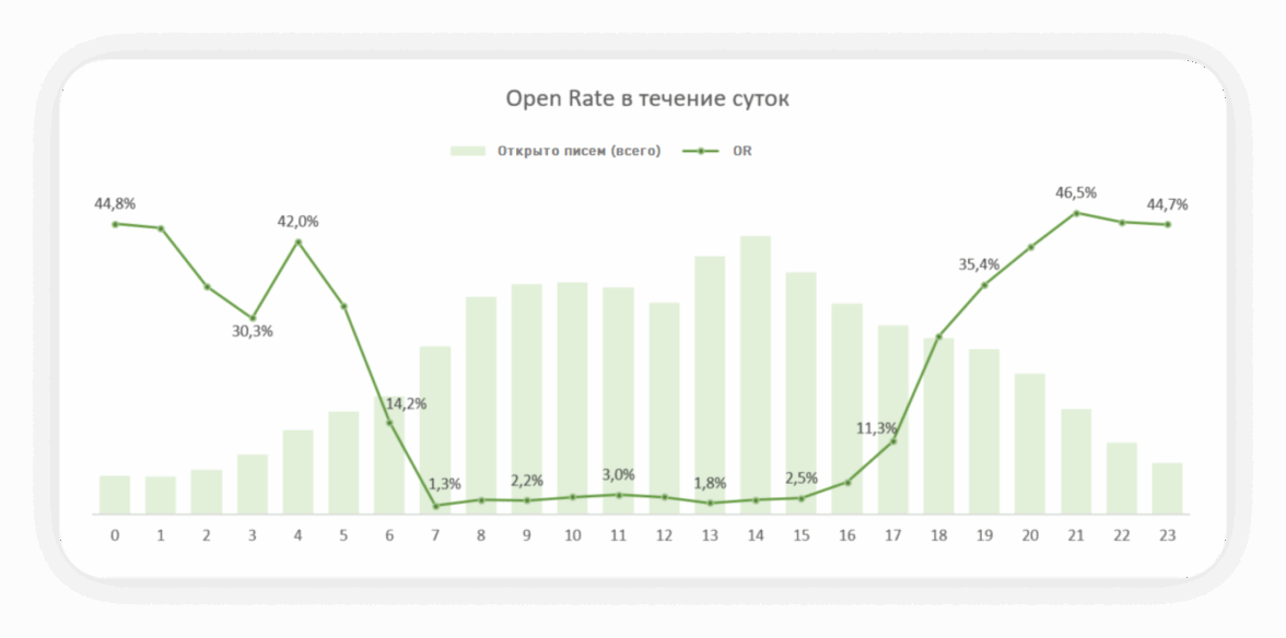 Это говорит о том, что письма удобно читать днем —, но действия чаще совершаются вечером, когда у человека больше личного времени. Такой разрыв между Open Rate и Click Rate открывает окно для гибкой стратегии: информационные рассылки лучше планировать на середину дня, а письма с CTA (призыв к действию) и акциями — ближе к вечеру.