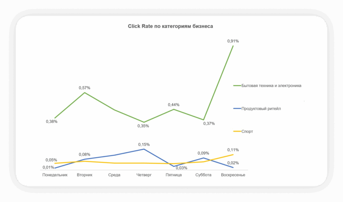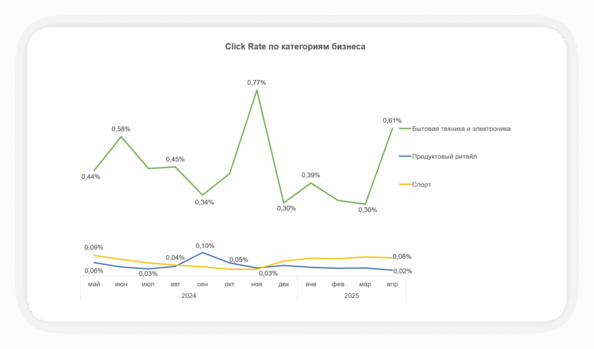 • В продуктовом ритейле средний Click Rate — 0,01–0,15%, без сильных колебаний в течение года.