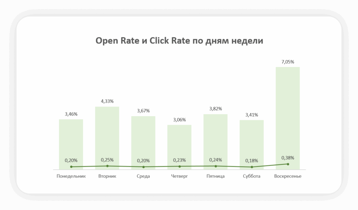 • Вторник (4,33%) и воскресенье (7,05%) — дни с самым высоким Open Rate.
