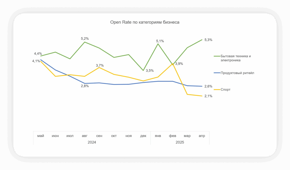Продуктовый ритейл и категория «Бытовая техника и электроника» демонстрируют разные уровни вовлеченности потребителей в email-рассылках, что обусловлено различиями в характере предложений и потребительских интересах.