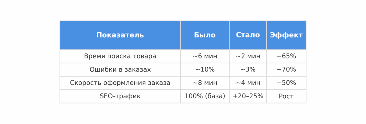 Эффект: исчезли ошибки, вызванные ручным обновлением, менеджеры перестали тратить часы на корректировки, маркетинг получил возможность запускать акции и SEO-страницы на реально доступные товары.