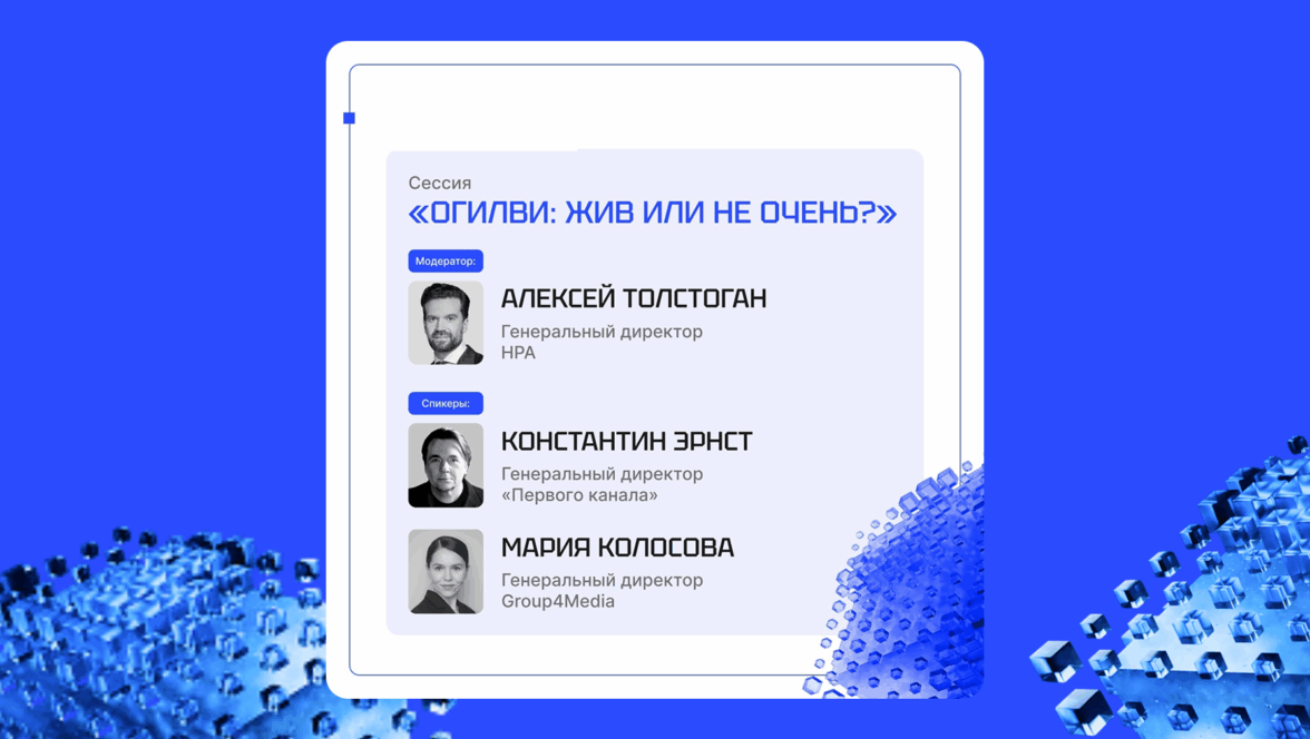 Сессию «Огилви: жив или не очень» открыл Алексей Толстоган, генеральный директор НРА, который представил результаты исследования, проведённого Национальным Рекламным Альянсом совместно с IPSOS. В рамках исследования оценивалась актуальность пяти постулатов Дэвида Огилви и отношение к ним директоров по маркетингу на сегодняшний день. Участников дискуссии также попросили высказать своё мнение о значимости этих принципов.