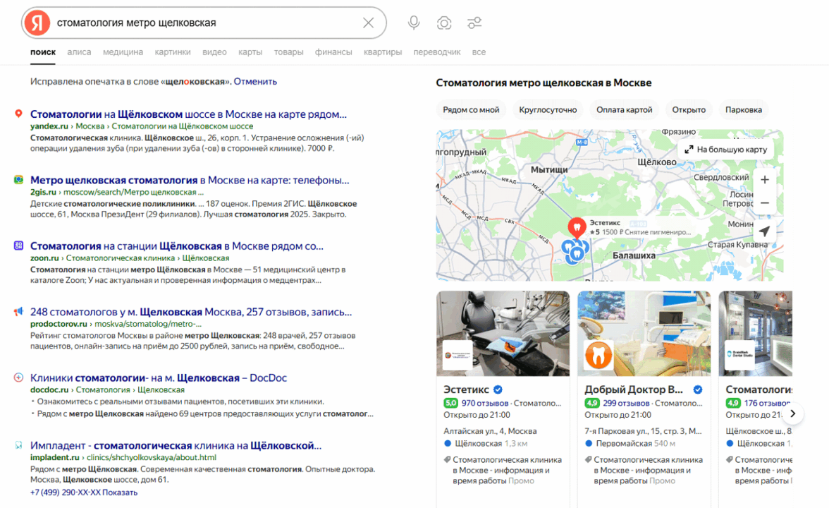 Аудитория приходит не только из поиска — с контекстной рекламы и РСЯ, Яндекс.Карт, по телефону, из медицинских агрегаторов типа ProDoctorov, мобильных приложений. Мы рекомендуем использовать максимальное количество каналов, ведь отсутствие любого из них — это потеря доли рынка.