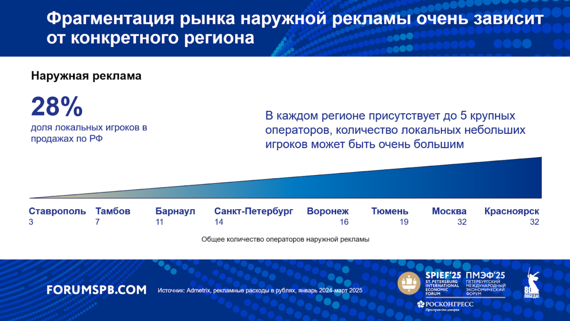 В наружной рекламе наблюдается та же ситуация: фрагментация рынка очень зависит от конкретного региона — существует большое количество локальных операторов со множеством качественных рекламных поверхностей. С помощью платформы Samba by Okkam можно выбрать правильный микс, оптимизировать и цену, и качество.