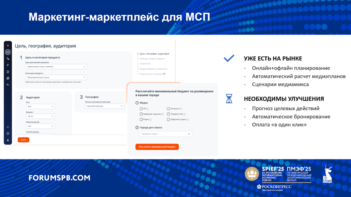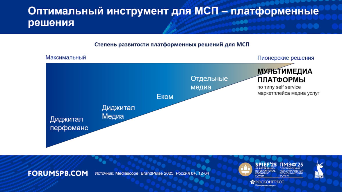 «Нашими глазами цифровое развитие рекламного рынка в части МСП лежит именно в развитии платформенных решений для самостоятельной работы с доступом к различным каналам. Часть таковых на рынке уже существует. Безусловно, все привыкли к тому, что есть кабинеты для работы с digital-performance инструментами, появилось большое количество self-service решений для работы с медиа, распространен и понятен E-com. В каждом отдельном медиа есть попытки создать удобный инструмент, который даст достаточный аналитический материал и позволит просто и быстро получить доступ к рекламному инвентарю», — объяснила спикер.