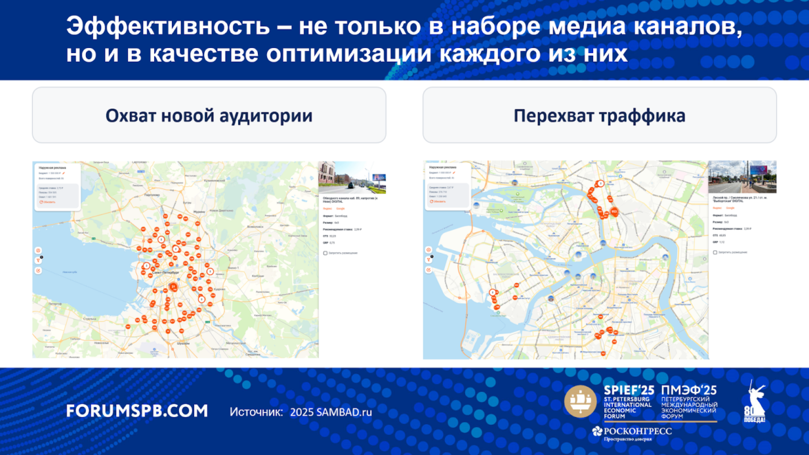 На фото ниже — два примера медиапланов для наружной рекламы, составленных при одинаковом бюджете, но с разными стратегическими целями. Один план направлен на максимальный охват новой территории, второй — на перехват трафика у конкурента. Видно, насколько по-разному выглядят рекомендации в каждом случае. Без такой аналитики легко полагаться на субъективную интуицию и ошибиться, в то время как цифры могут подсказывать более эффективное решение.
