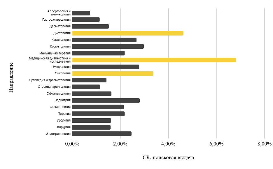 Конверсия у рекламы топовых направлений такая высокая, поскольку пациенты обращаются с уже сформированной потребностью. С учетом того, что им точно надо сдать анализы и им подходит стоимость, решение принимается быстро.