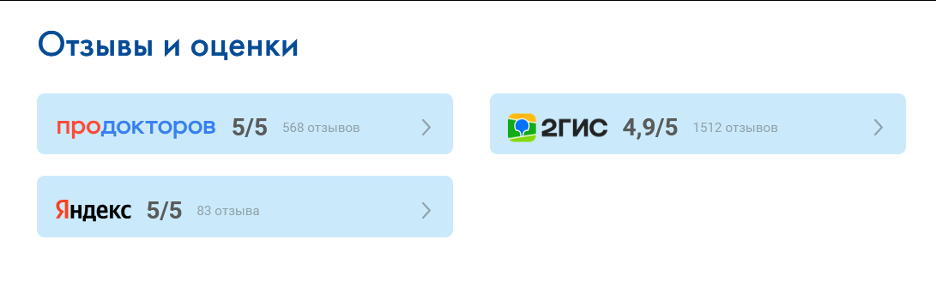 Не забывайте расположить информацию о рейтинге на различных площадках на сайте клиники. Для клиента Ingate Performance такой блок позволил пользователям не тратить время на сбор рейтингов клиники, а сразу видеть их на сайте.