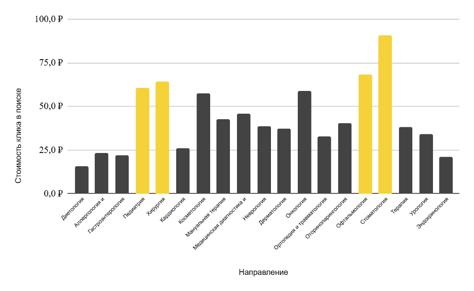 С другой стороны, нужно понимать, что в медицинских сферах с высокой конкуренцией CPC гораздо выше, но «дорогие» направления медицины позволяют окупать рекламный бюджет и выходить в «плюс». Например, педиатрия входит в дорогие направления, из-за того, что молодые родители часто выбирают платные клиники для своих детей. Они готовы платить за комфорт ребенка и более мягкий подход к лечению. Также это направление подразумевает под собой чаще всего дополнительные процедуры, такие как анализы/вакцинации.
