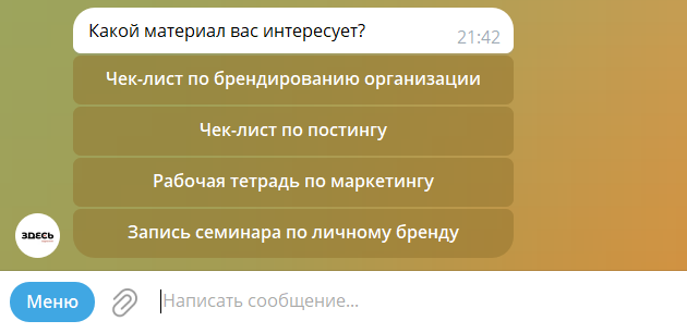 • Запрос материала: пользователь отправляет команду или сообщение с запросом на получение конкретного маркетингового материала (например, чек-листа или записи семинара).