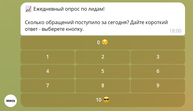 В агентстве «ЗДЕСЬ» работает большое количество сотрудников, многие из которых находятся на удаленной работе. Для упрощения процесса сбора базовых метрик и отчетности, бот используется для автоматического сбора ежедневной статистики от сотрудников. Каждый день сотрудники отправляют данные через бот, который структурирует эту информацию для дальнейшего анализа.