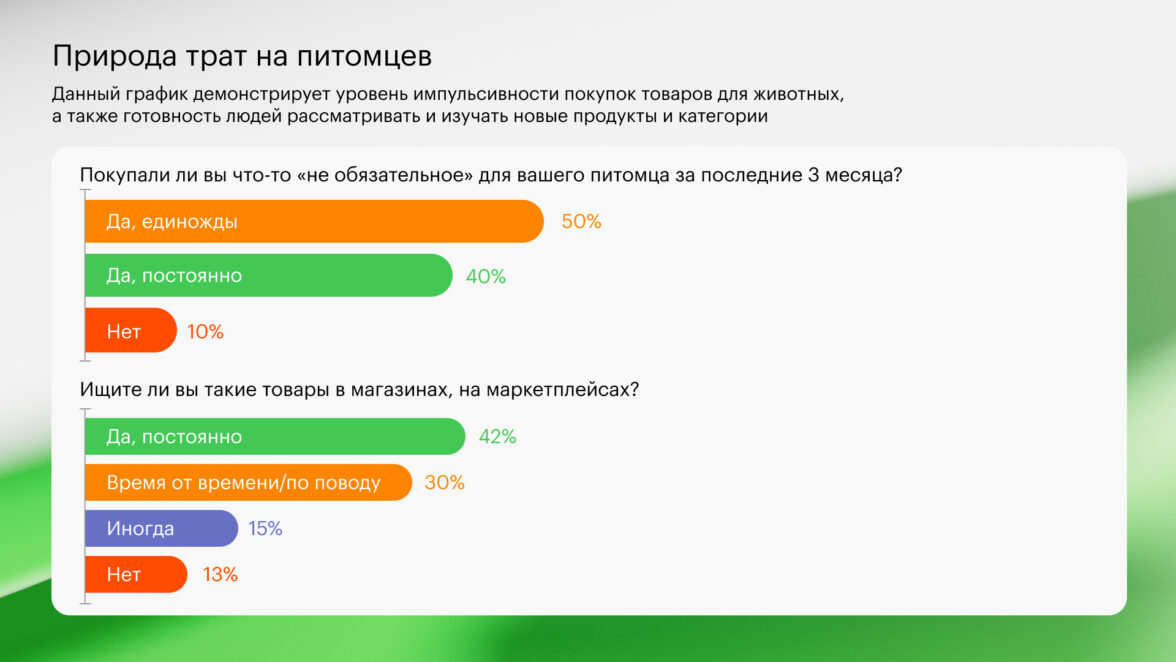 Параллельно виден сервисный разрыв: в спец-HoReCa (груминг, ветклиники и др.) неудовлетворённость качеством услуг и продуктов у аудитории среднего класса — 30–50%; в несмежных сервисах (например, авиакомпаниях) недовольство качеством услуг для питомцев — до 75%; по пет-отелям уровень тревожности/недовольства превышает 80% у тех, кто ещё не пользовался услугой. При этом готовность пользоваться допуслугами, улучшающими условия питомца, доходит до 95% (если не думать о цене), а готовность пробовать новые сервисы (например, выгул) растёт с ~40% до 60–70% при наличии гарантий качества и безопасности. Практический вывод для брендов: в «пет»-тематике нельзя ограничиваться коммуникацией — ценности должны быть доведены до управленческих решений, а pet-friendly и забота должны подтверждаться правилами, сервисом и ответственностью, иначе «уровень прощения» обнуляется мгновенно.