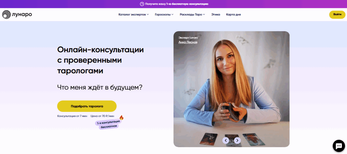 Lunaro — крупная платформа, где работают проверенные ясновидящие: тарологи, рунологи, медиумы. Каждая женщина с даром сдаёт трёхэтапный вступительный тест: видение через фотографию редактора, чтение даты рождения и рассказ о будущих событиях проекта. Только после подтверждения врождённый дар эксперт попадает в каталог. В профиле указан стаж, процент точные предсказания и отзывы клиентов.