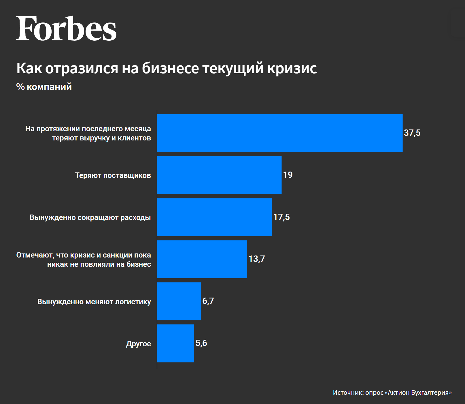 Согласно результатам опроса «Актион Бухгалтерия» для Forbes, каждый третий бизнес на протяжении последнего месяца теряет выручку и клиентов, 19% — остаются без поставщиков, 6,7% — вынужденно меняют логистику.