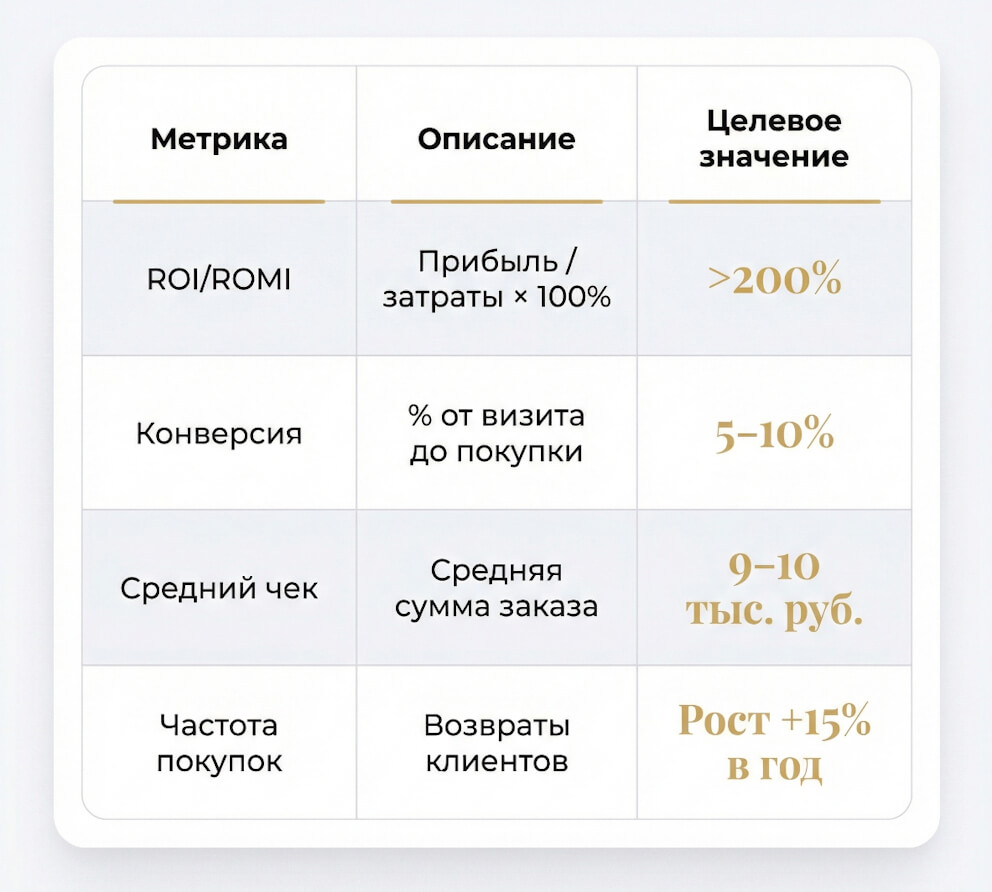 Возврат инвестиций (ROI) или возврат маркетинговых инвестиций (ROMI) показывает, насколько эффективно работают вложенные деньги. Формула простая: делите прибыль от маркетинговых активностей на затраты на маркетинг и умножаете на 100%. Если ROMI больше 100% — вложения окупаются. Если меньше — нужно искать проблему и корректировать стратегию. Для успешного ювелирного бизнеса целевой показатель ROMI составляет 200% и выше.