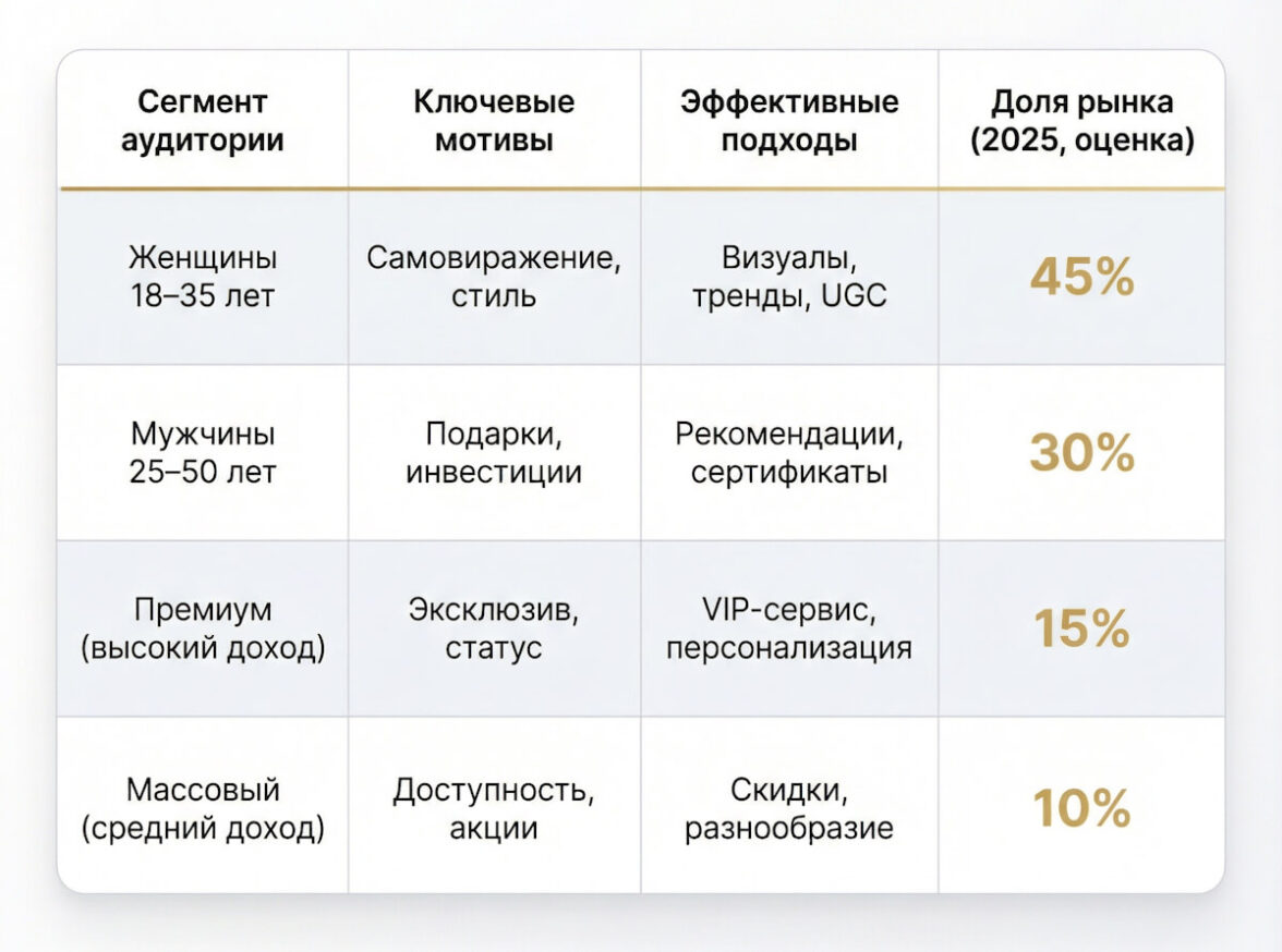 Как сегментировать аудиторию: женщины vs мужчины, массовый рынок vs премиум, покупка для себя vs подарок — каждому сегменту нужны свои каналы и сообщения.