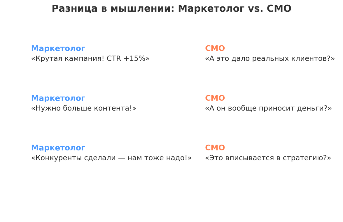 CMO — это уже не про маркетинг в чистом виде. Это стратег, лидер и бизнесмен, который понимает финансы, управляет людьми, анализирует рынок и умеет говорить на языке бизнеса.