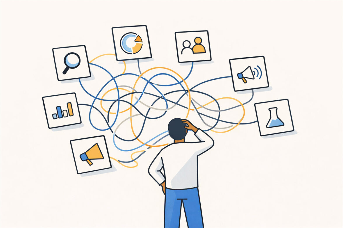 Пример: разработчик B2B-ПО опрашивает всех подряд обо всём — тренды, цены, интеграции… Итог: сотни страниц, но непонятно, добавлять ли модуль аналитики, который просили ключевые заказчики.