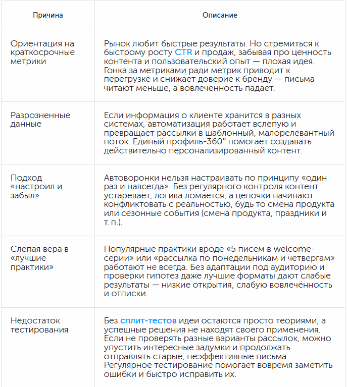 Недостаток гибкости, чрезмерная частота коммуникации и регулярные сбои в логике чаще всего приводят к тому, что сценарии начинают раздражать аудиторию. Для предотвращения этого необходим регулярный аудит цепочек, их адаптация под изменяющееся поведение пользователей и постоянное тестирование гипотез.