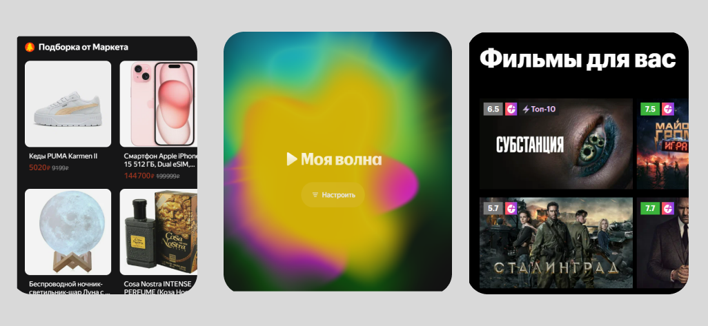 Если вы предлагаете много товаров на сайте, то вам может помочь искусственный интеллект. Его возможности активно используются многими крупными компаниями. Например, в Яндекс Музыке для «Моей волны» подбираются те композиции, которые с большей вероятностью вас заинтересуют. Большие объемы данных о прослушанных вами треках обрабатываются системой, и вам предлагают то, что скорее всего отвечает вашим интересам. В Кинопоиске от Яндекса также есть рекомендации, основанные на тех фильмах, которые вы смотрели ранее. И на макетплейсах действует тот же принцип: вам показывают подборки товаров, которые вы запрашивали ранее.