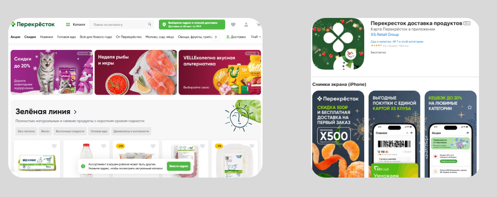 Например, вы продаете товары, и у вас есть приложение, сайт и офлайн-точки продаж. Важно, чтобы у пользователя сохранялась история взаимодействия с вами, независимо от того, где он находится. То есть бонусные баллы могут быть начислены как за покупки в магазине, так и за онлайн-покупки. И если пользователь на сайте отложил в корзину товары, то они должны отображаться в приложении, как и история просмотра товаров. Также важно сохранение единого стиля во всех каналах, чтобы не путать пользователя. Например, у магазина «Перекресток» есть приложение и сайт, которые синхронизируют данные о пользователях.