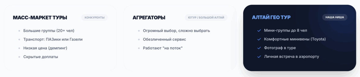 Анализ основных игроков рынка («Большой Алтай», «Ютур», «Странник») выявил ключевые точки дифференциации. Рынок рекламы для туров на Алтай насыщен предложениями «масс-маркет», где страдает сервис.