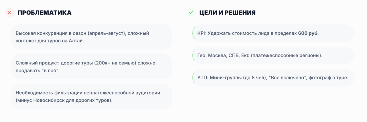 Быстрый запуск отдельных лендингов под «Маральник» и «Горящие туры» дал 60% результата в пик.