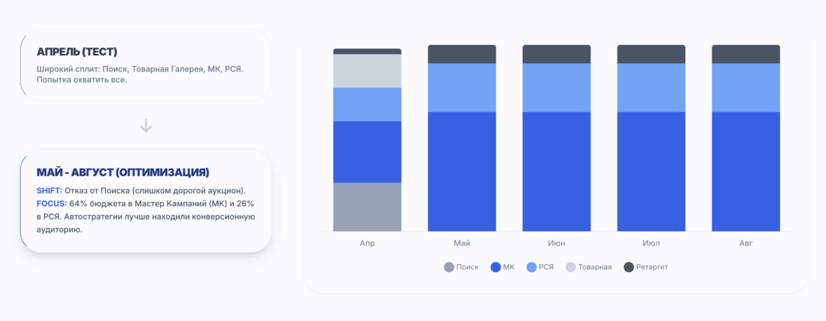 Анализ эффективности каналов заставил кардинально сменить сплит бюджета после первого месяца (Апрель). Мы ушли от дорогого «Поиска» в сторону автостратегий, оптимизируя контекст для турагентства.