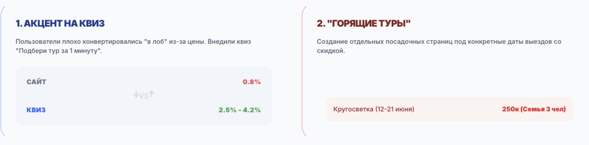 Столкнувшись с низкой конверсией прямой посадочной страницы (0.8%) из-за высокого чека (200 000₽+), мы внедрили стратегию Квизов («Подбери тур за 1 минуту»).