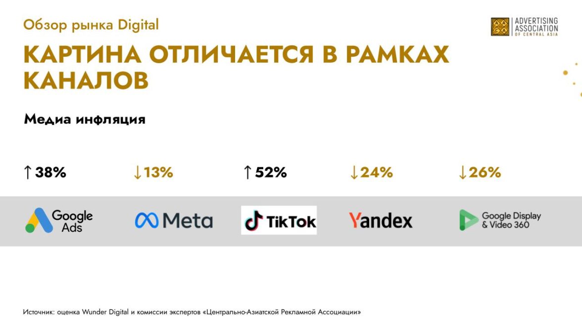 Действительно, стоимость привлечения растёт, а ёмкость рынка не расширяется такими же темпами. К тому же медиаинфляция в Казахстане одна из самых высоких в мире (согласно данным Wunder Digital и комиссии экспертов «Центрально-Азиатской Рекламной Ассоциации», ECI Management).