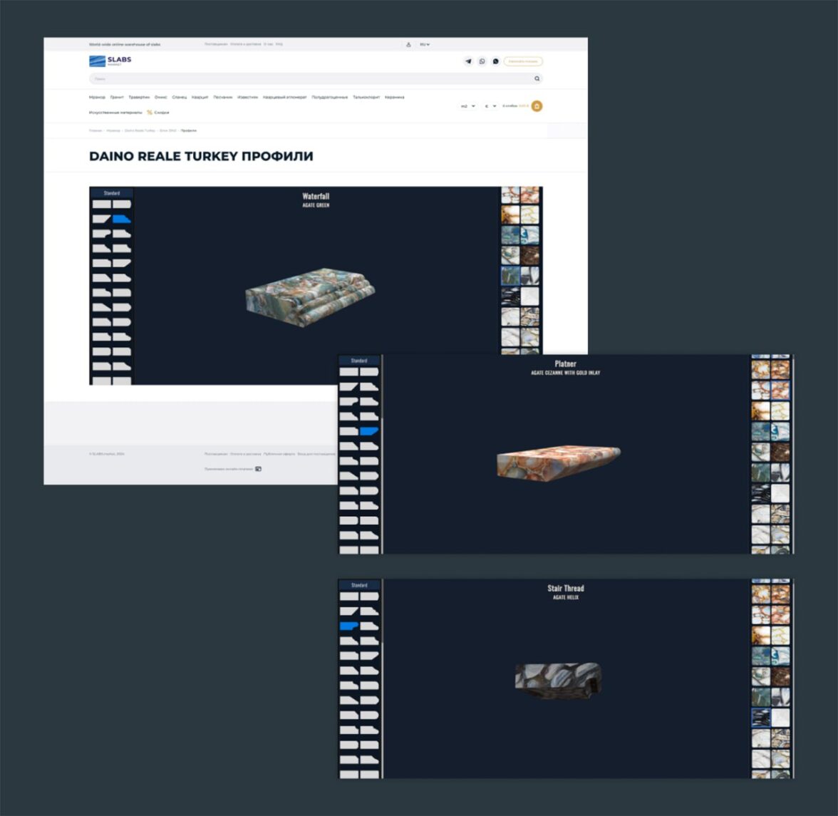 Чтобы покупатель смог заранее оценить товар и понять, подойдет ли камень под его нужды, мы оснастили сайт несколькими инструментами визуализации. Так, например, на сайте есть возможность составить нужную комбинацию, выбрав тип камня и профиль слэба, а затем рассмотреть ее всех сторон, поворачивая 3D-модель прямо на экране.
