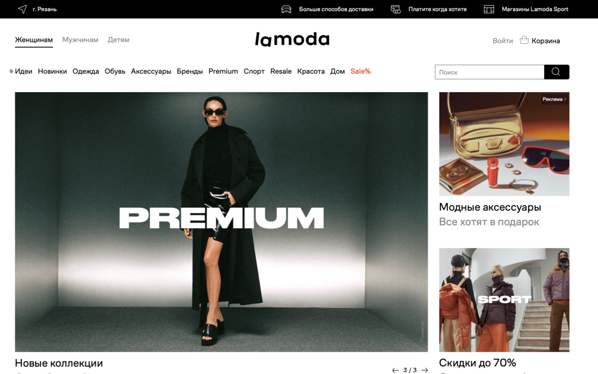 Маркетплейс одежды, обуви и аксессуаров, который работает с брендами в эконом и более дорогих ценовых сегментах. Здесь более серьёзный порог входа и проверка продавцов. Продавать на Lamoda могут только состоявшиеся бренды с определённым количеством товарных категорий, потому что компания строго следит за репутацией.