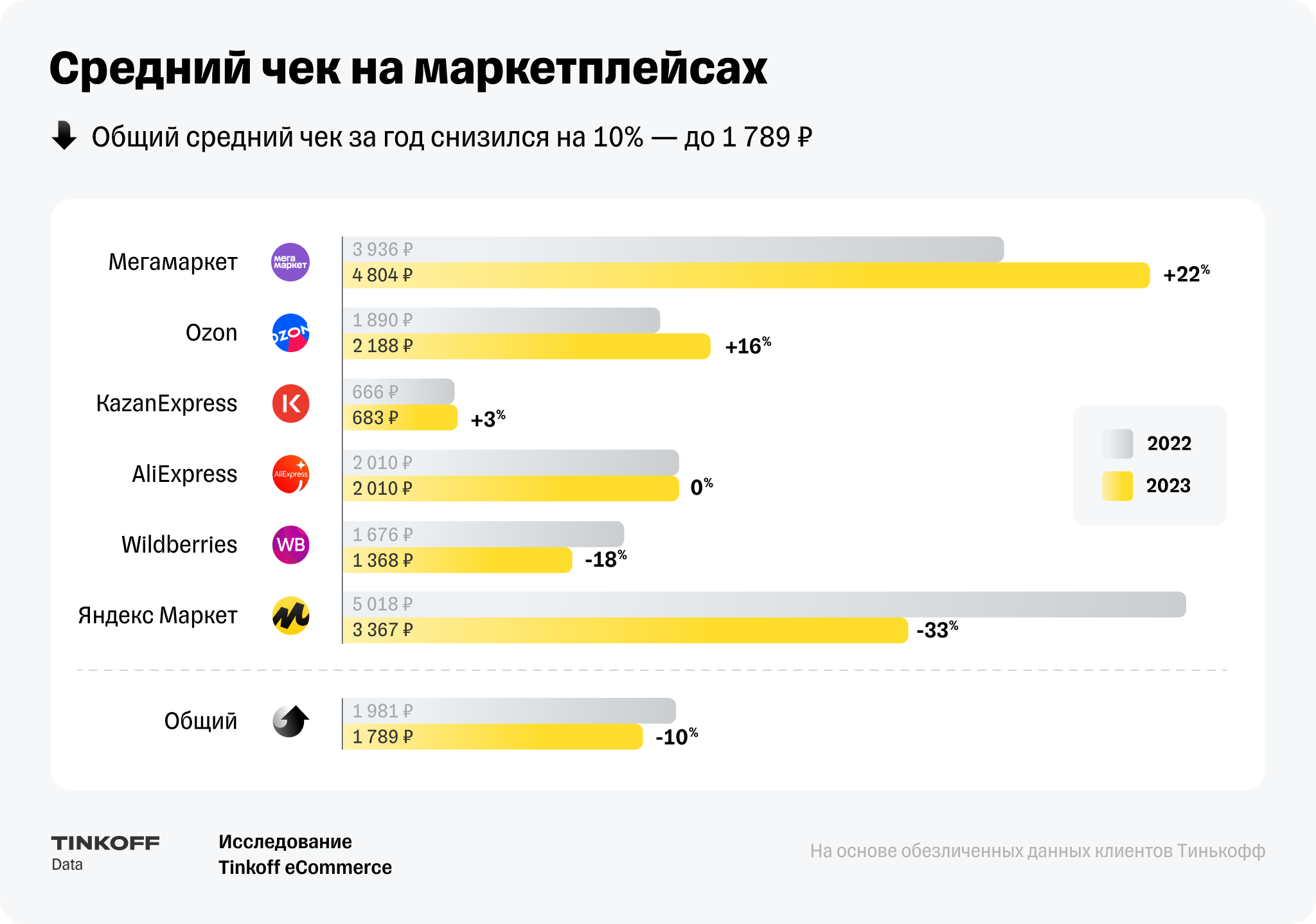 В прошлом году россияне потратили на маркетплейсах в 1,5 раза больше, чем в 2022 году. Лидерами по обороту, как и годом ранее, стали Wildberries и Ozon, на которых пришлось 86% продаж. Несмотря на увеличение объема торговли и числа транзакций (63% год к году), средний чек снизился на 10%, до 1789 рублей. Селлеры ищут новые каналы реализации товаров. Многие мигрируют с площадки на площадку, а количество продавцов, которые торгуют на двух и более маркетплейсах, выросло на 17%.
