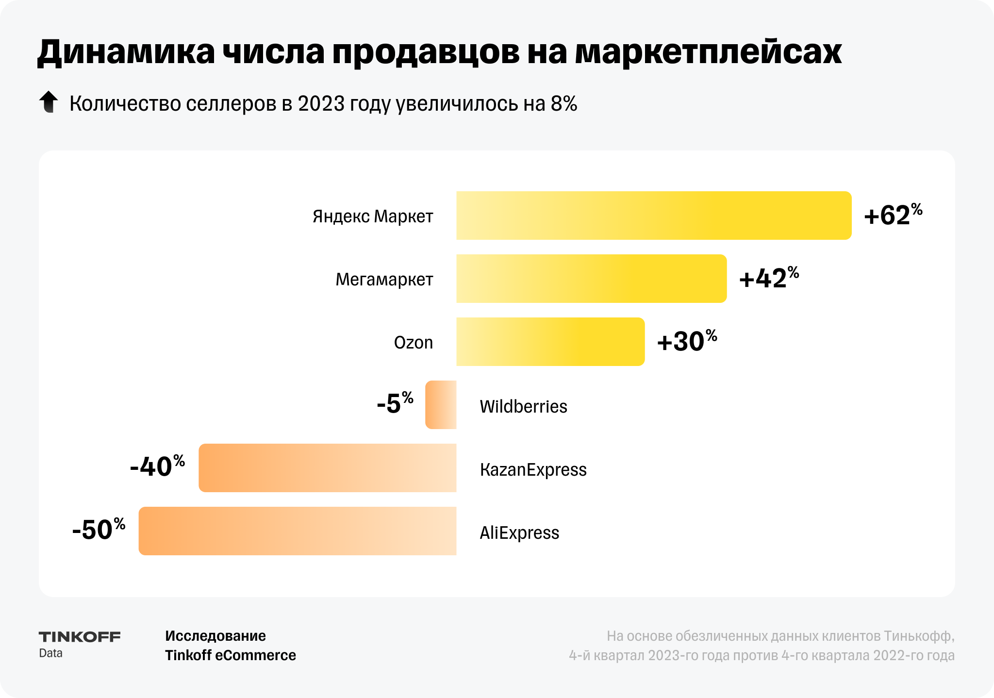 Прирост новых активных продавцов на маркетплейсах замедлился. В прошлом году их число выросло всего на 8%. Судя по исследованию Tinkoff eCommerce, селлеры активно мигрируют с менее эффективных площадок на более прибыльные. Так, если у лидеров по этому показателю, «Яндекс Маркета», «Мегамаркета» и Ozon, количество продавцов выросло на 64%, 42% и 30%, соответственно, то экспресс-аутсайдеры потеряли селлеров: KazanExpress – 40%, а AliExpress – 50%,