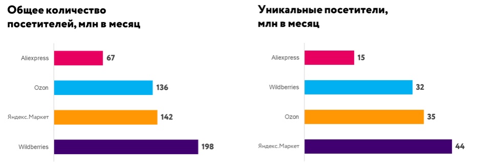 Данные по ежемесячной посещаемости сайтов указывают на первенство Wildberries по общему количеству посетителей. Но при этом лидером по уникальным посетителям оказывается Яндекс.Маркет — их доля составляет более 30%. Большую роль в привлечении новых пользователей играет ассортимент, но об этом чуть ниже.